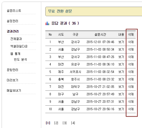 잘못된 응답치를 웹상에서 쉽게 삭제할 수 있도록 "결과 관리" 메뉴에서 응답 결과를 삭제할 수 있도록 하였습니다.