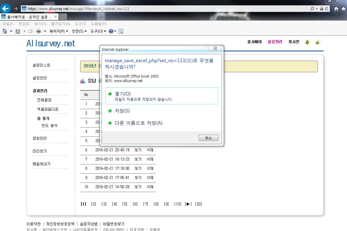 설문결과의 엑셀파일 다운로드와 관련해서 문의 드립니다.